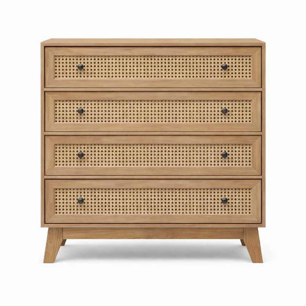 Commode à 4 tiroirs avec façades en cannage de rotin. Elle propose plusieurs rangements pour le linge de lit ou les vêtements. Ce meuble compact peut être intégré à différents espaces comme le salon, l'entrée ou la chambre. La structure est en MDF robuste avec des pieds solides. Dimensions totales : 80l x 35P x 95H cm.
